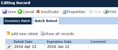 The Batch Retest module allows the user the ability to add and display retest information for the selected inventory item.