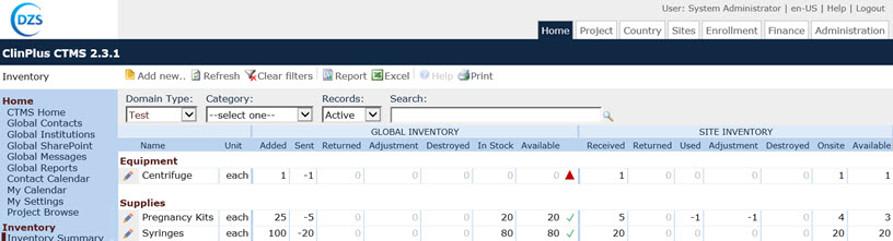 The Inventory Summary page lists all the inventory items that are used in all projects. Users with the proper permission can add items into the Global Inventory and view the status of each inventory item globally and at the site level. To view the status of a particular site, you will need to select the project and then the site on the Sites tab.