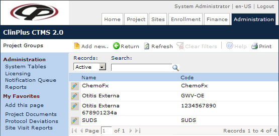 The Project Groups page lists all the groups within a standard project. These could be areas that the study is being conducted on, such as Lymphoma or Blood Transplant.