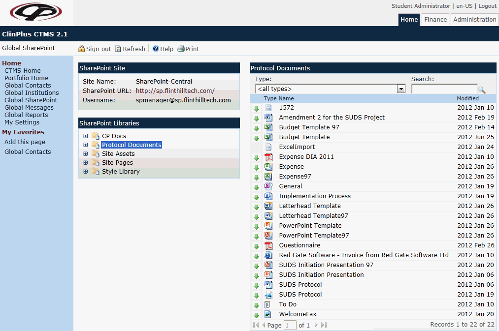 Since documents are stored in SharePoint, users do not need to maintain them in CTMS, although they could. When a CTMS document is linked to a SharePoint document, the most current version of the document will be retrieved from the SharePoint Site when the user requests a downloaded copy from CTMS. A copy of the SharePoint document is stored in the CTMS database in case the SharePoint link becomes unavailable due to network connectivity failure, permission changes, or document file relocation or renaming. When this occurs, the user will be notified that they are viewing an older, saved version of the document. The user cannot update a document from CTMS to SharePoint. In addition, only SharePoint Libraries and Documents are integrated with CTMS, not Lists and Discussions.