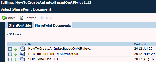 The purpose of this page is to select a SharePoint Document from a SharePoint Site.