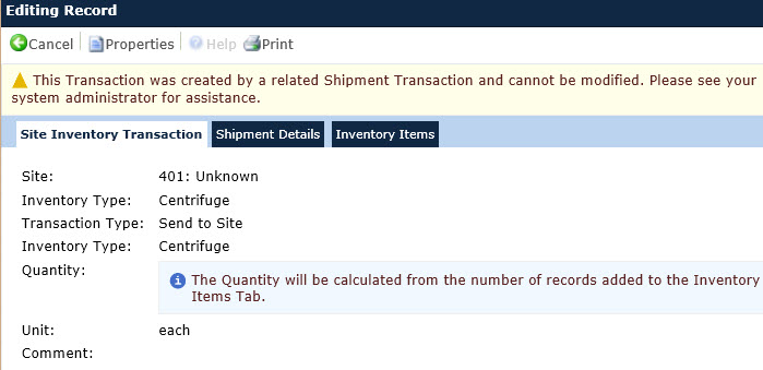 The Inventory Transaction module allows the user the ability to add or edit an inventory transaction record for the selected site. Transactions include to Add to Inventory, make an Adjustment, Return from Site, and Send to Site. An additional tab, called Shipment Details, will appear when the Transaction Type field is set to Send to Site or Return from Site.