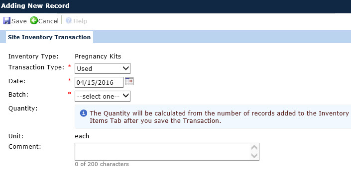 This field will be hidden when the Show Unique ID field is checked on the Inventory Type module. If visible, this field is required and is restricted to integers between 1 and 999999. A message will display in place of the Quantity field instructing the user that the quantity will be determined by the number of records on the Inventory Items tab. |