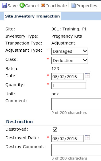 This field will be visible when the Transaction Type is set to Adjustment and the Destroyed field is checked. If visible, this field is required. |