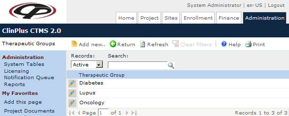 The Therapeutic Groups page lists all the therapeutic groups that will be available in other modules. These groups should be the diagnosis of the subjects in the trial, such as lung cancer or diabetes.