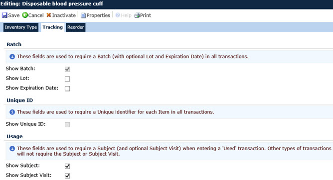 The Tracking tab allows the user the ability to indicate whether the inventory item needs to include a Batch number, Lot number, Expiration Date, Unique ID, Subject and/or Subject Visit.