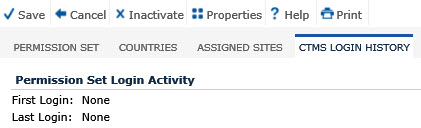 The CTMS Login History provides a record of when the contact first and last time they accessed the project using the current permission set. Additional tabs include Permission Set, Countries, and Assigned Sites.