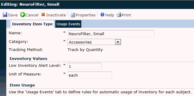 The user can add or edit one inventory item at a time in this module. The user determines the Tracking Method for each item. Items can be tracked by Quantity, Lot Number, or Item. If Lot Number is selected, then the lot number must be entered into the inventory in the Inventory Lot module before the sites can indicate its use. Once the inventory item is entered, the tracking method cannot be changed. Items tracked by Quantity or Lot Number can be automated based on Subject Visit, Gender, Subject Group, or Custom Field value under the Usage Events module. As an example, the user can set the system to reduce the inventory item (i.e. testing kit) by a certain quantity (i.e. 2) for every screening event. Actual transactions are posted on the Site Inventory page. Users can establish a warning flag for the site when inventory reaches a critical number that is set in the Low Inventory Alert Level field.