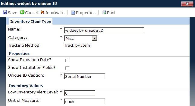 This field displays only when editing an existing record. It will be hidden when the Tracking Method field is set to Track by Quantity. If the Tracking Method field is set to Track by Item, the default value will be Serial Number. If the Tracking Method field is set to Track by Batch/Lot, the default value will be Lot Number. The field can hold up to 25 characters and is required. |