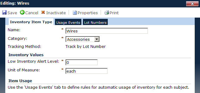 , the Usage Events and Lot Numbers tabs become available to add more information about the item, which is the same screen (see the following image) that appears when clicking