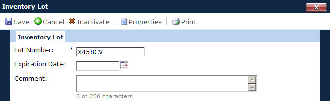 The Inventory Lot page provides the user with a place to store specific information on the inventory item. The lot number must be entered here before the site can select the item.