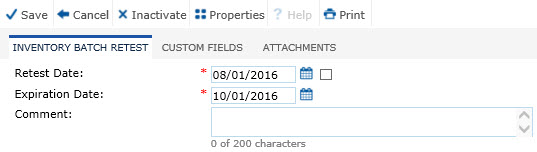 The Inventory Batch Retest module allows the user the ability to add an individual retest record for the selected inventory item. Additional tabs may appear including Custom Fields (if defined) and Attachments.