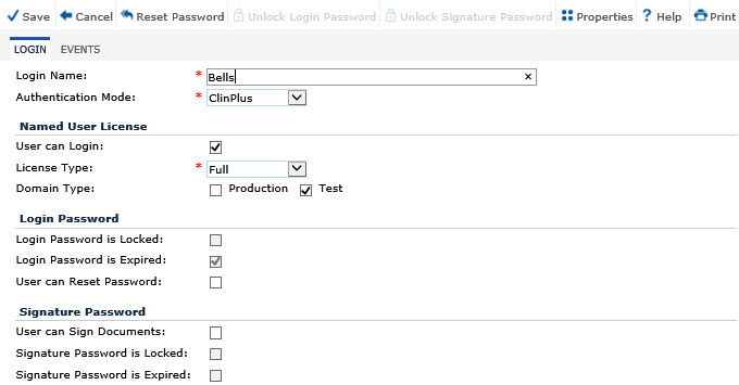 This is a read-only check box and is only displayed if the Authentication Mode field is ClinPlus CTMS. A check will appear in this box if the user has attempted to login and failed beyond the number of times set in the System Configuration variable under the Security configuration group. To release the lock, click the Unlock Login Password button. |