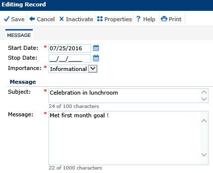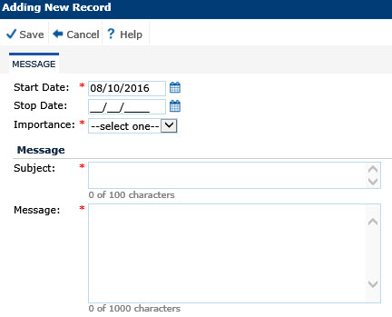 In the Message tab, the user can add or edit a single Global Message. A message is considered current when the stop date is greater than or equal to today, or no stop date has been entered. An expired message is when the stop date has passed.