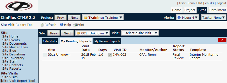 Additional information can be found on the Site Visits, Pending Approval, Pending Review, and My Recent Reports tabs.