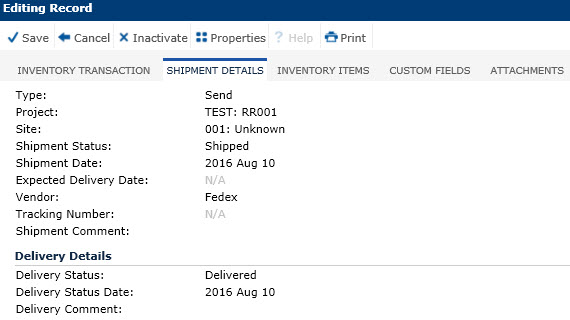 The Shipment Details module will be visible when the Transaction Type is set to Send to Site or Return from Site. The fields on this tab are read only.