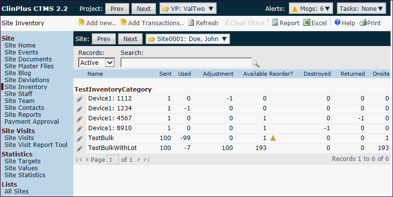 Administrators manage Inventory Categories in the Inventory Category List module in the System Tables. Users with access to the Project Inventory module on the Project tab can add items to the inventory. Those items that are tracked by Quantity or Lot Numbers are automatically listed. Those items tracked by Item must be added manually. Warning flags alert users to re-order inventory. These quantities are set in the Inventory Item Type module.