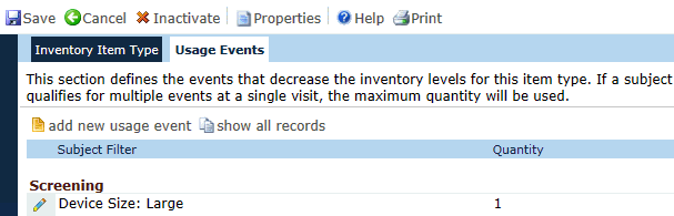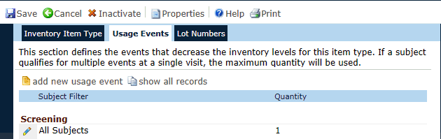 The Usage Events tab displays the different ways that the inventory for a selected item will be reduced by a site. This tab is visible when the Tracking Method is set to Track by Quantity or Lot Number, but not Track by Item. Additional information is available on the Inventory Item Type and Lot Numbers tabs.